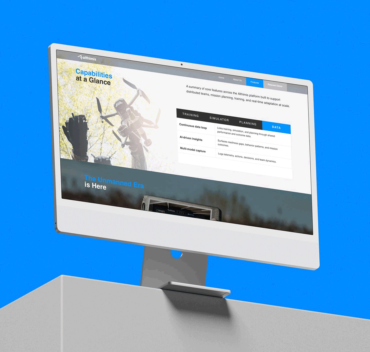 Althimis came to us at a pivotal moment: they were redirecting their advanced, large-scale virtual environment technology from digital events toward drone and unmanned UAV training at scale. With the pivot underway and time to market critical, they needed a website that could quickly and credibly reframe the technology for a defense audience without glossing over the depth or flexibility of the platform itself.